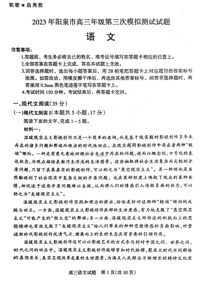 高三语文--山西省阳泉市2023届高三三模