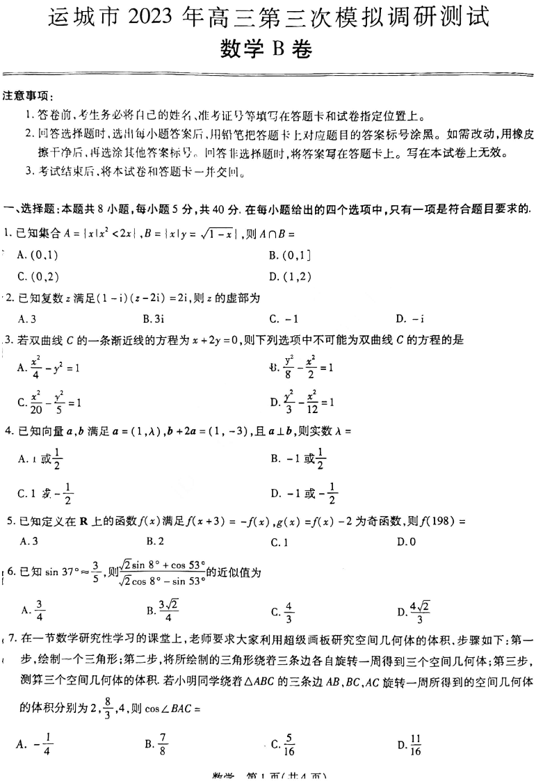 高三数学--山西省运城市2023届高三第三次模拟调研测试