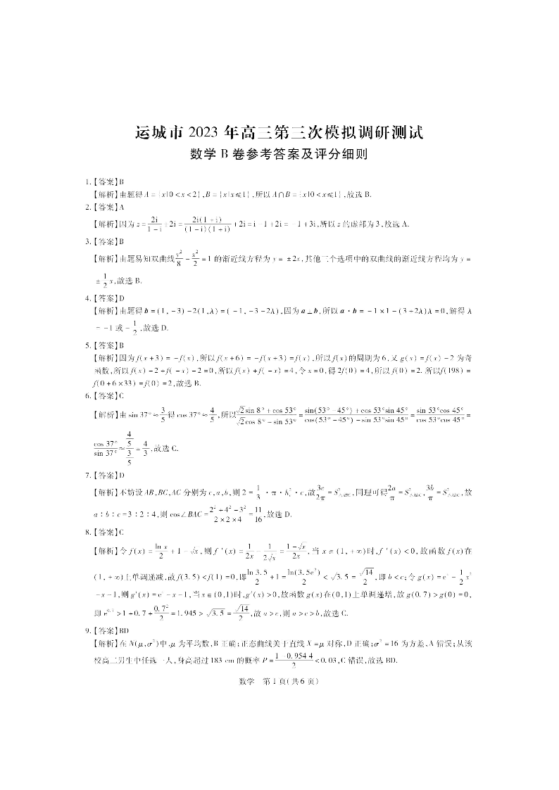 高三数学答案--山西省运城市2023届高三第三次模拟调研测试