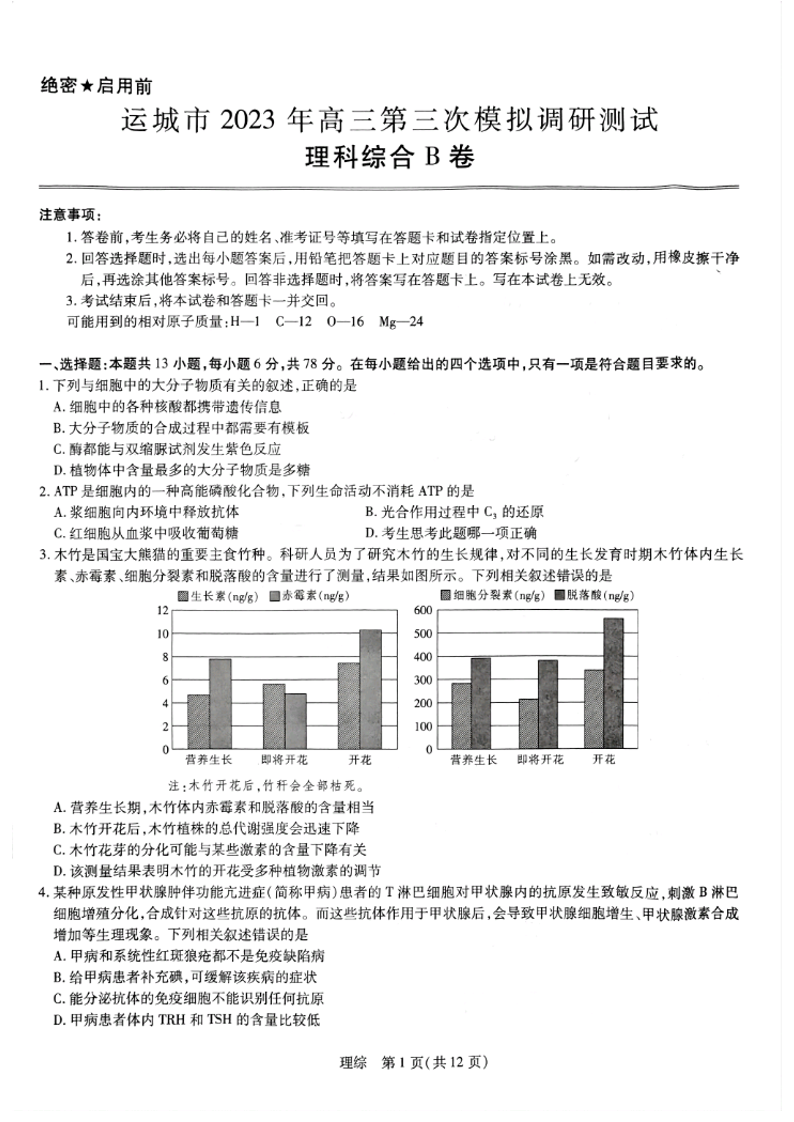 高三理综--山西省运城市2023届高三第三次模拟调研测试