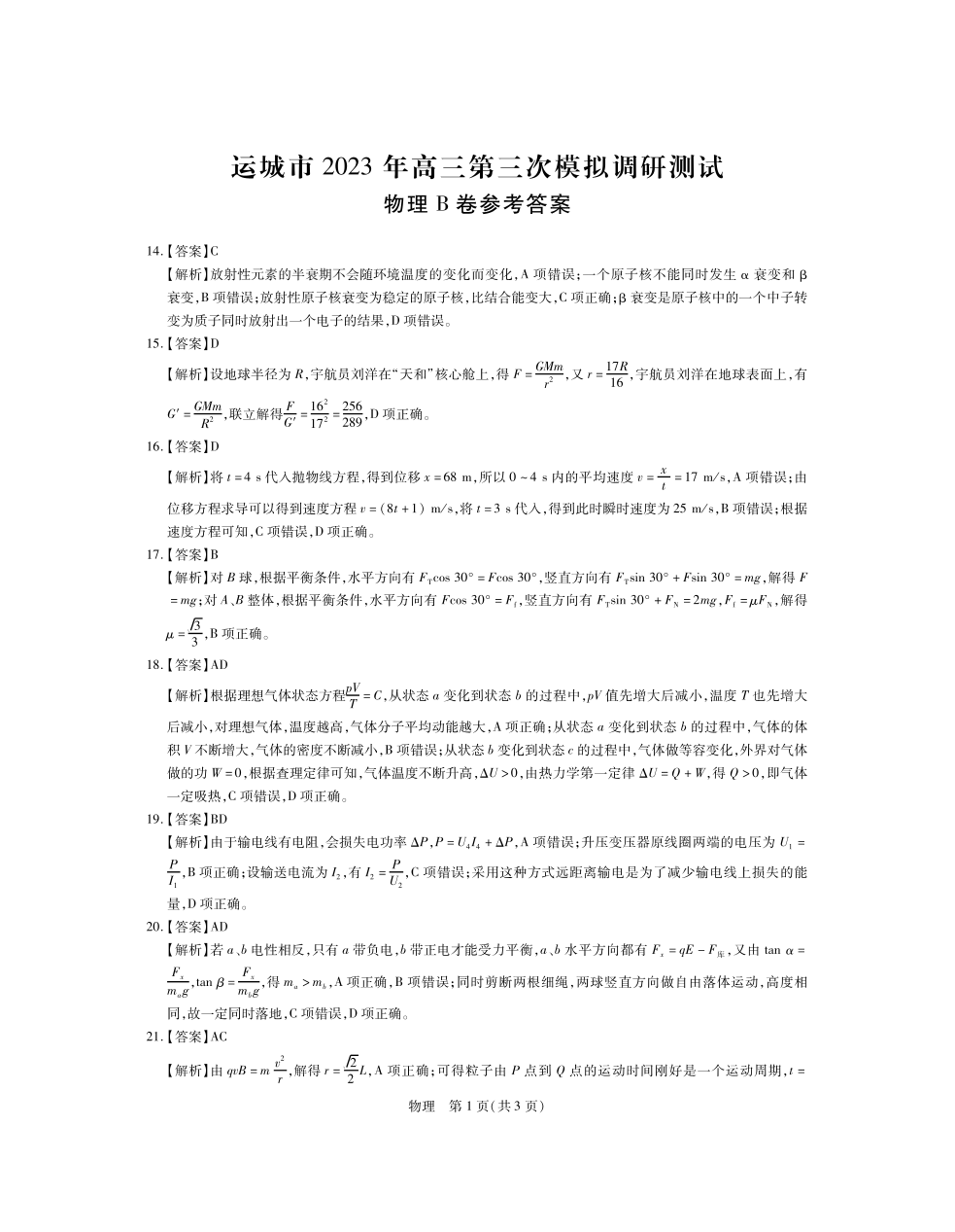 高三物理答案--山西省运城市2023届高三第三次模拟调研测试