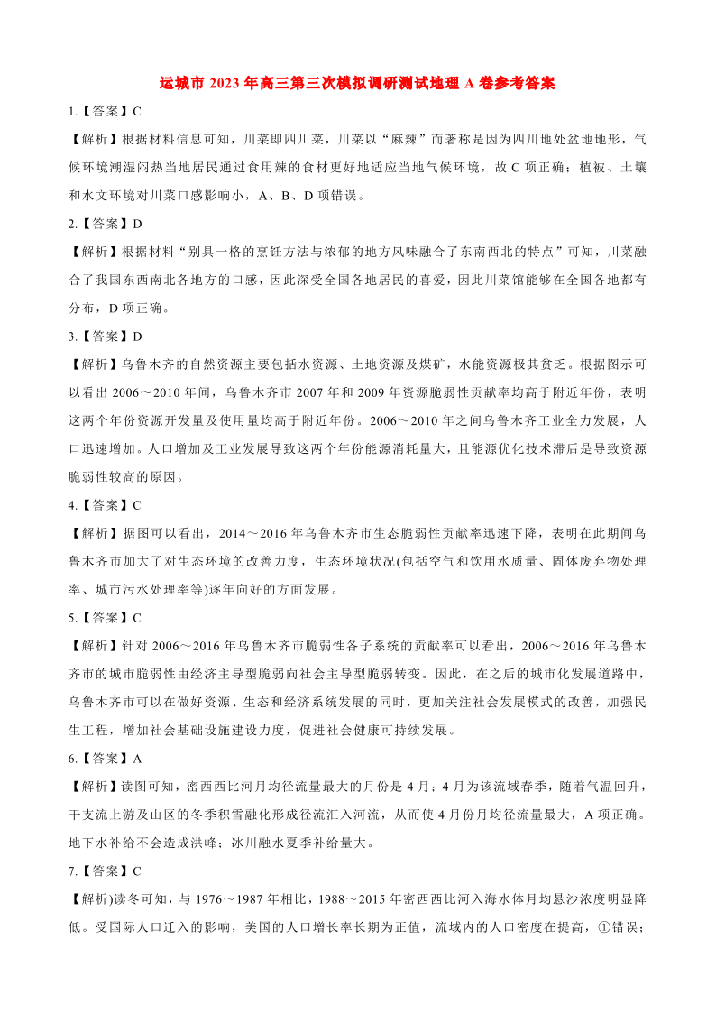 高三文综答案--山西省运城市2023届高三第三次模拟调研测试
