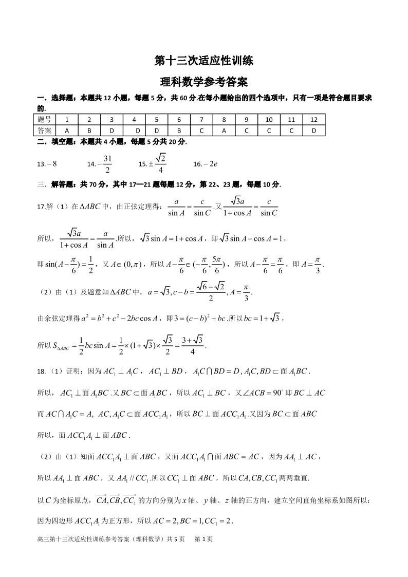 高三理数答案--陕西省西北工业大学附属中学2023届高三下学期第十三次适应性训练