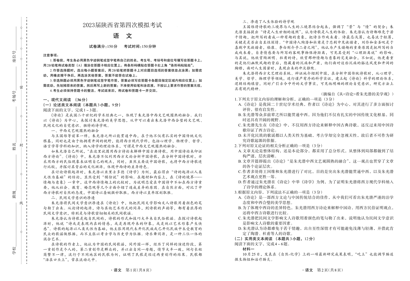 高三语文--陕西省2023届第四次模拟考试(菁师联盟)