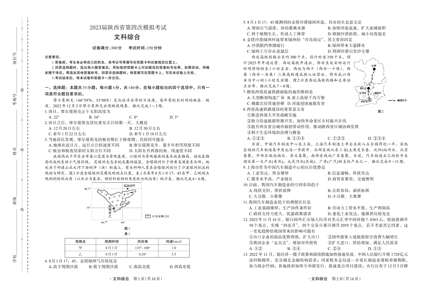 高三文综--陕西省2023届第四次模拟考试(菁师联盟)
