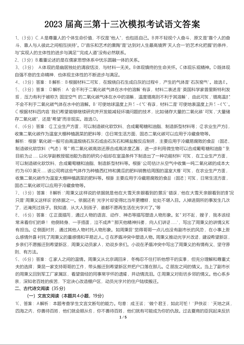 高三语文答案--陕西省宝鸡市2023届高三第十三次模考