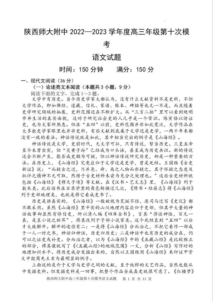 高三语文--陕西省西安市陕西师范大学附属中学2022-2023学年高三下学期第十次模考