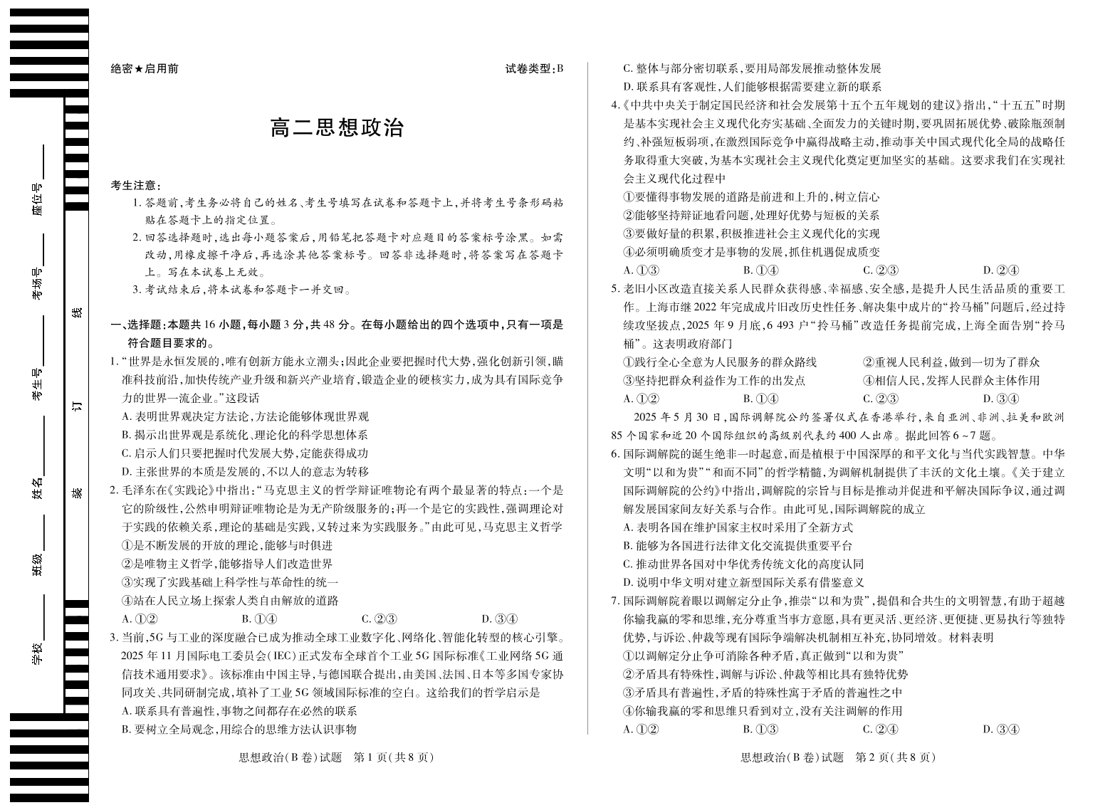 高二政治B--安徽省部分学校(合肥六中)2025-2026学年高二上学期12月联考