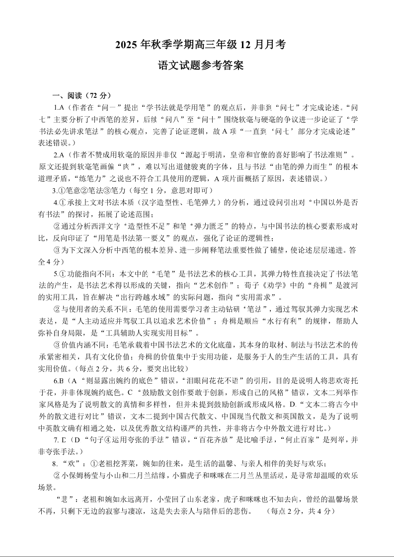 高三语文答案--湖北省荆州中学2026届高三上学期12月月考