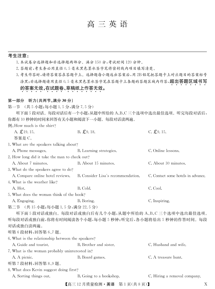 高三英语--辽宁黑龙江吉林内蒙古九师联盟高三12月质量检测