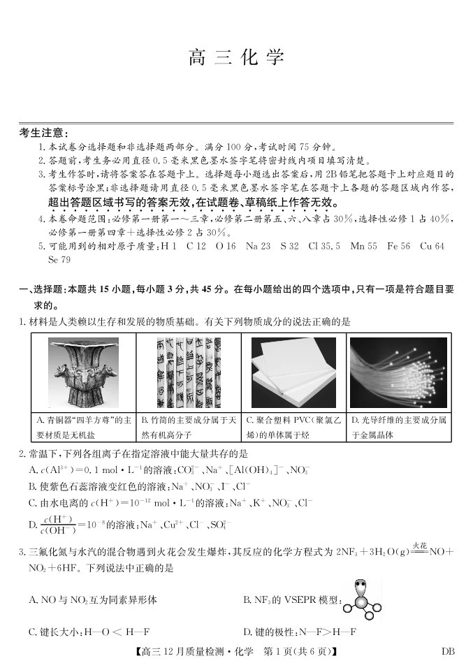 高三化学--辽宁黑龙江吉林内蒙古九师联盟高三12月质量检测