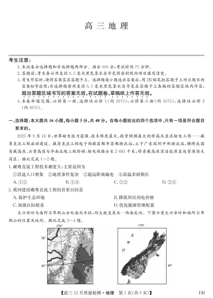 高三地理--辽宁黑龙江吉林内蒙古九师联盟高三12月质量检测