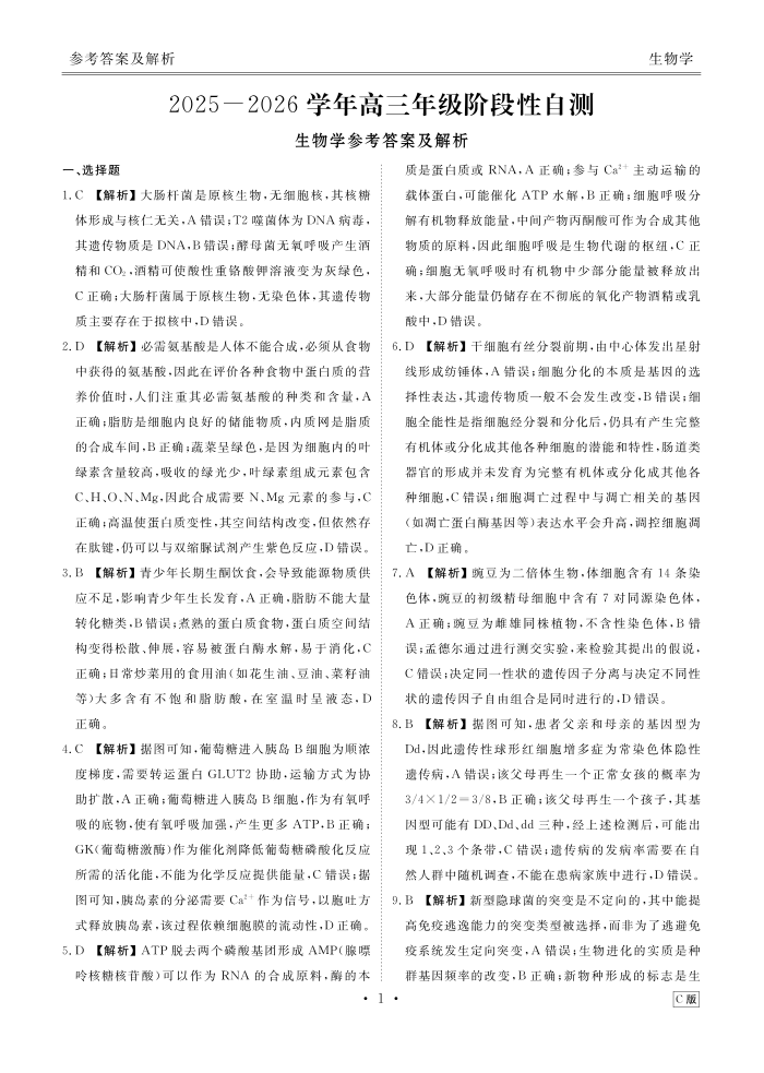 高三生物答案--内蒙古衡水金卷2026届高三上学期12月阶段性自测