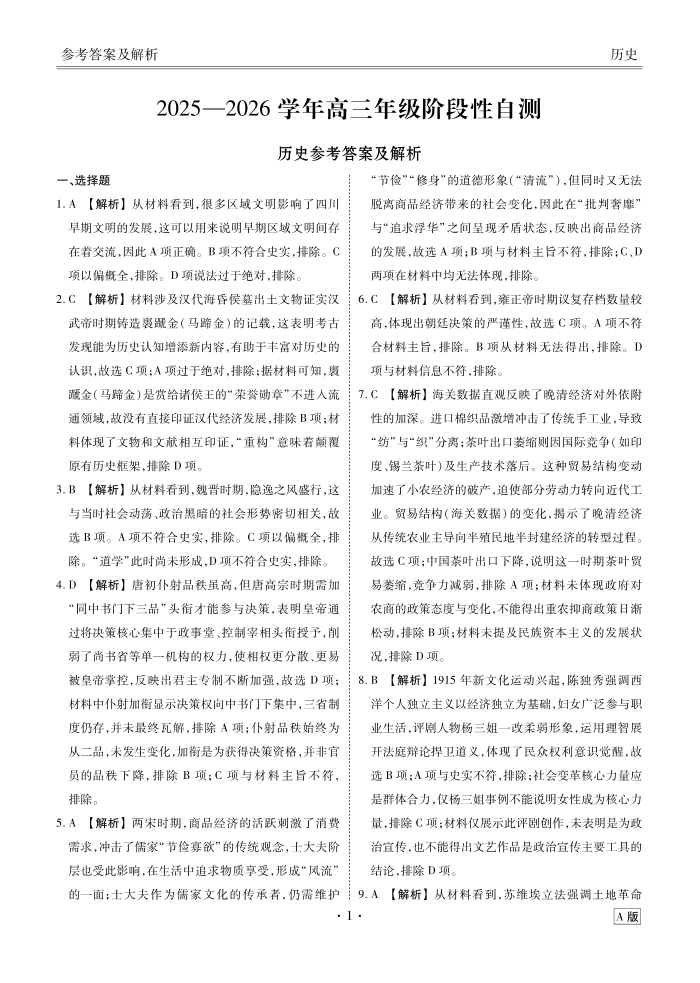 高三历史答案--陕晋青宁衡水金卷2026届高三上学期12月阶段性自测