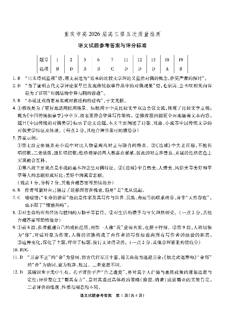 高三语文答案--重庆市南开中学2026届高三第五次质量检测