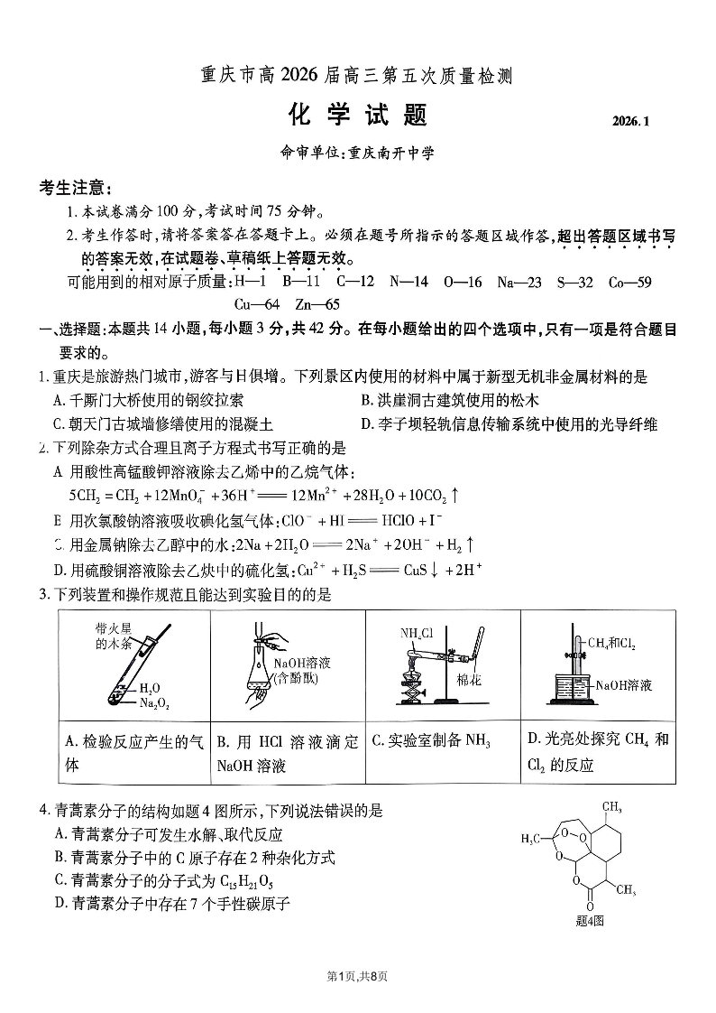 高三化学--重庆市南开中学2026届高三第五次质量检测