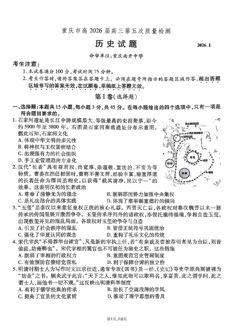 高三历史--重庆市南开中学2026届高三第五次质量检测
