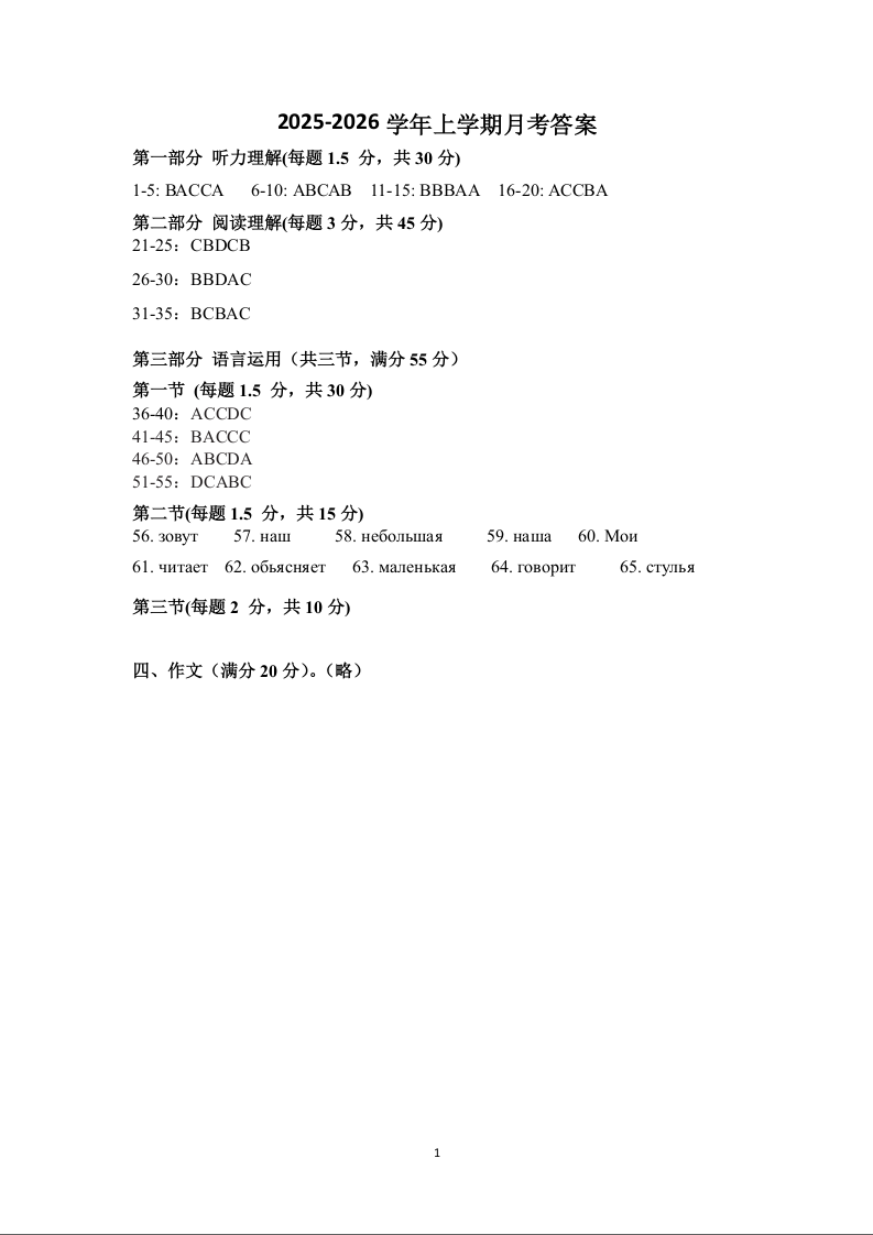高一俄语答案--河南省洛阳市强基联盟2025-2026学年高一上学期1月检测