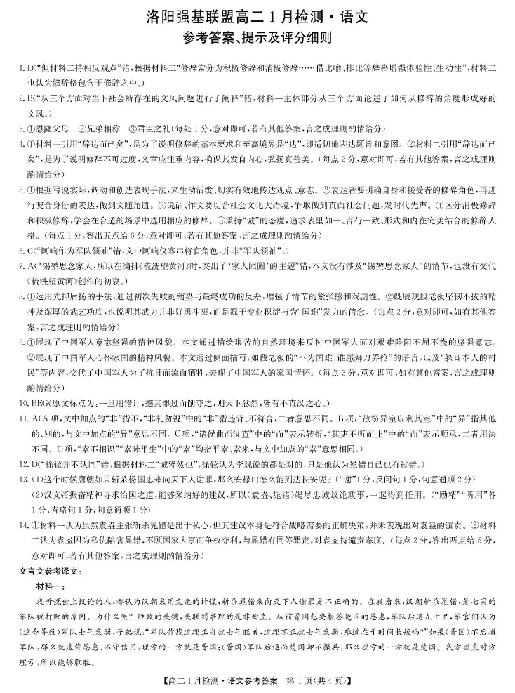 高二语文答案--河南省洛阳市强基联盟2025-2026学年高二上学期1月检测