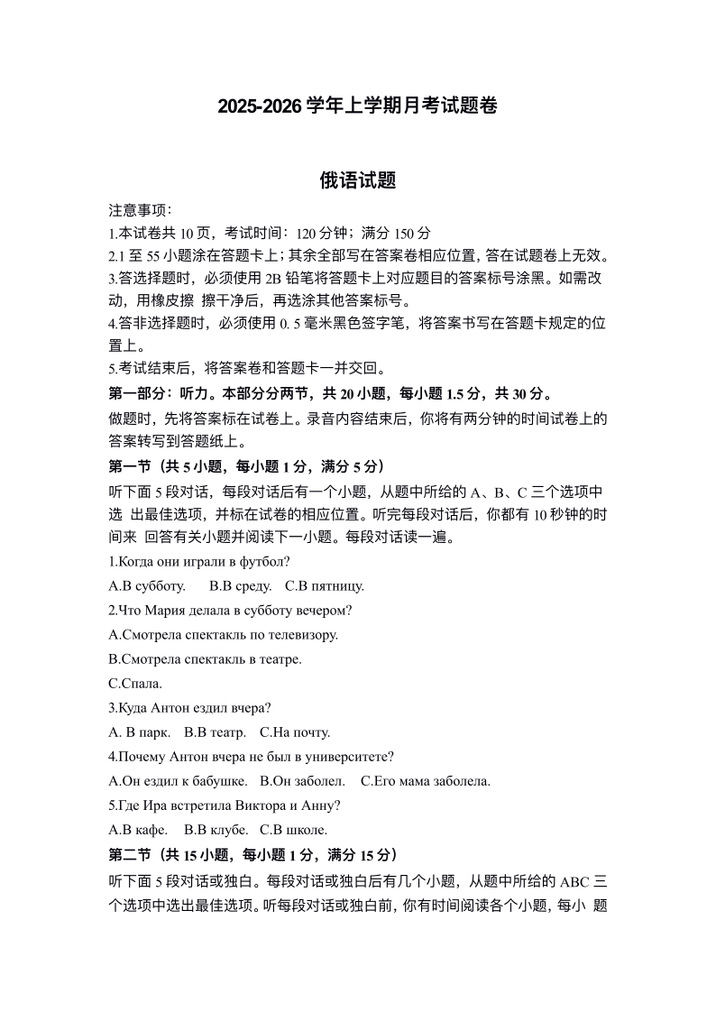 高二俄语--河南省洛阳市强基联盟2025-2026学年高二上学期1月检测