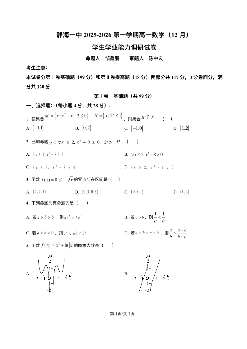 高一数学+答案--天津市静海区第一中学2025-2026学年高一上学期12月月考