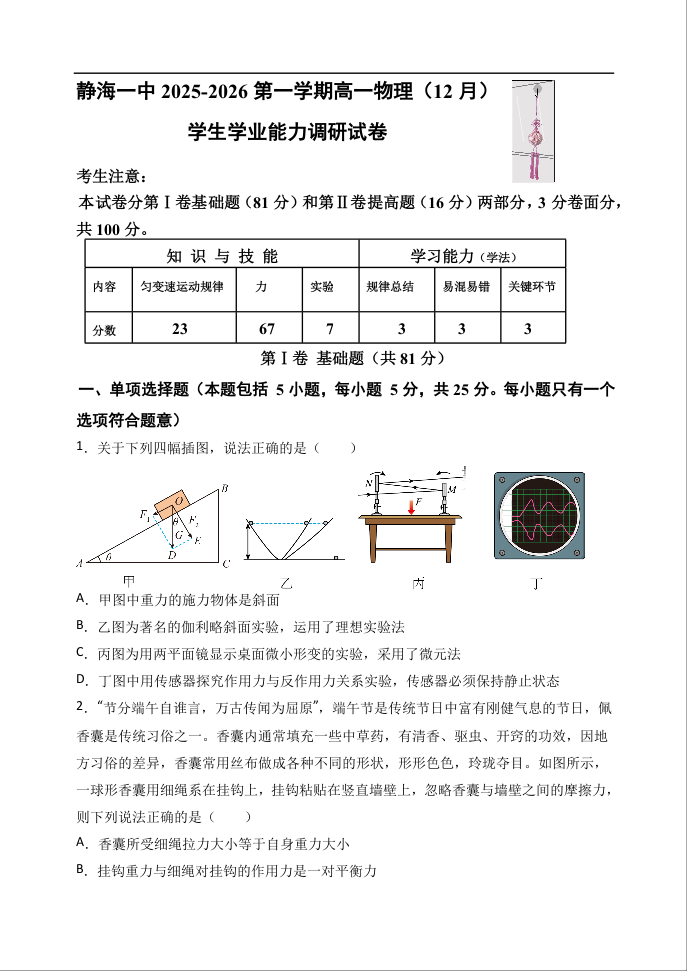 高一物理+答案--天津市静海区第一中学2025-2026学年高一上学期12月月考