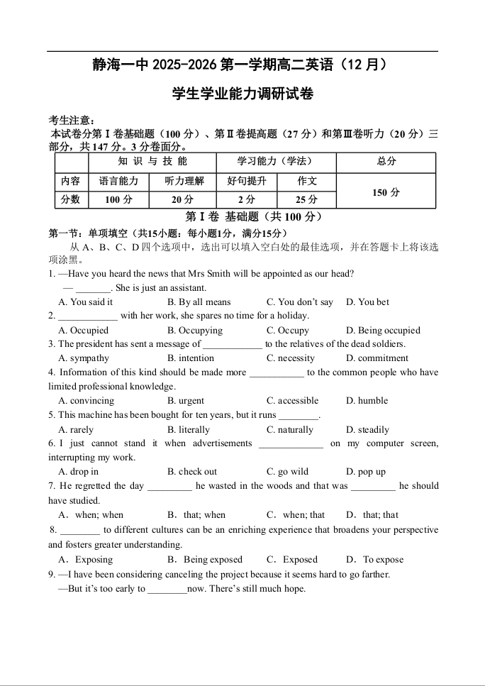 高二英语+答案--天津市静海区第一中学2025-2026学年高二上学期12月月考