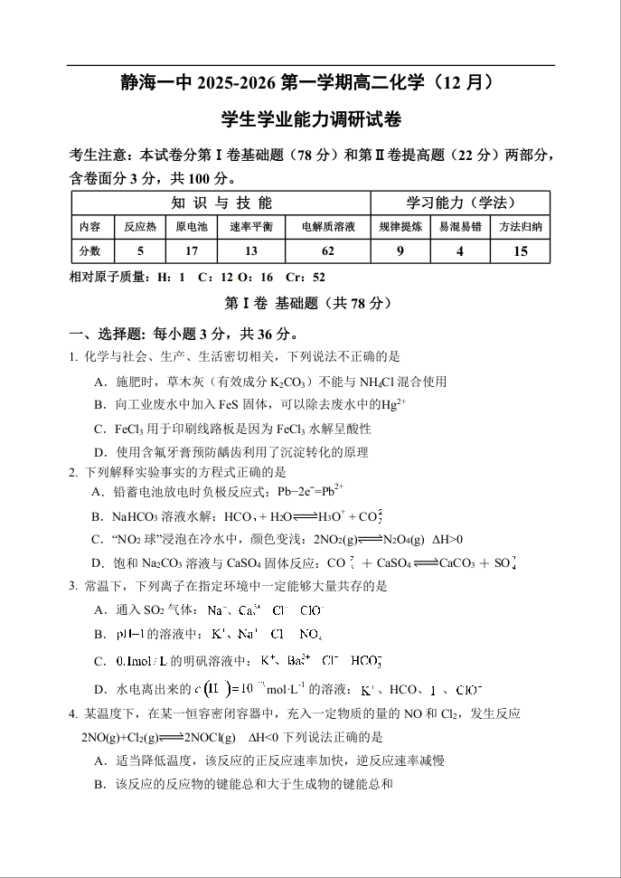 高二化学+答案--天津市静海区第一中学2025-2026学年高二上学期12月月考