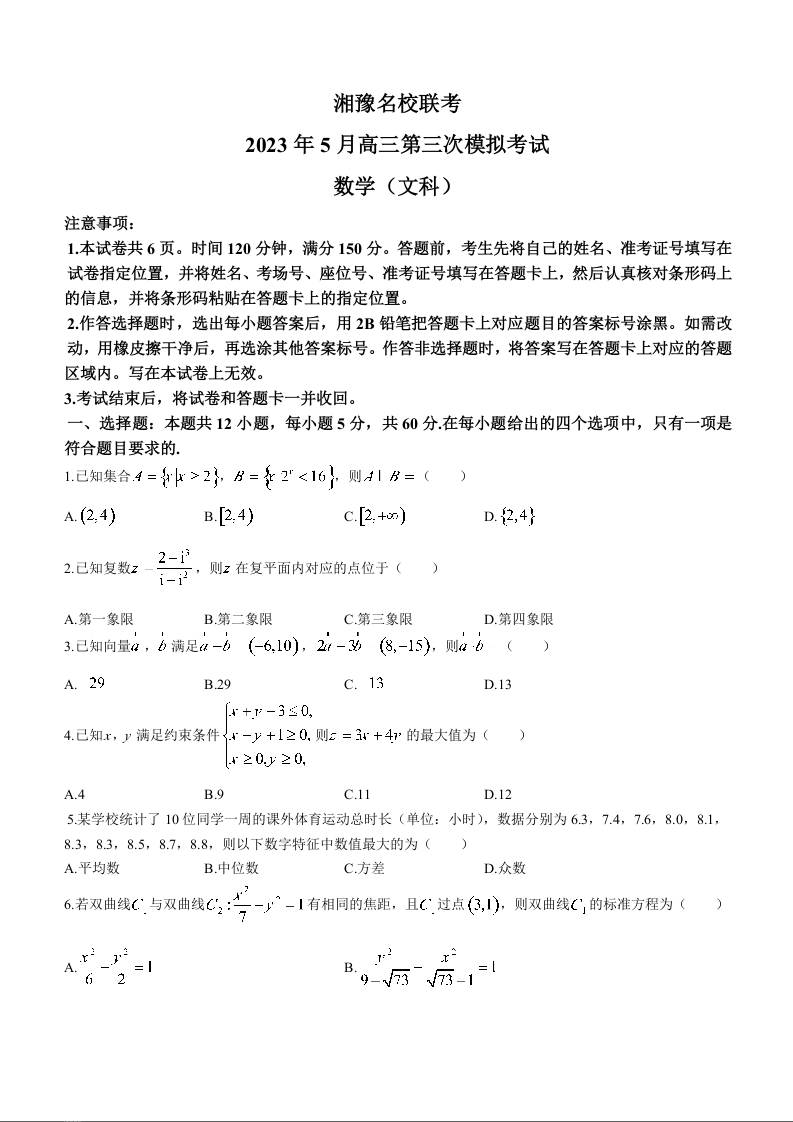 高三文数+答案--湘豫名校联考2023届高三下学期第三次模拟考试(5月)