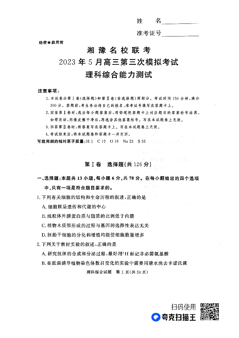 高三理综--湘豫名校联考2023届高三下学期第三次模拟考试(5月)