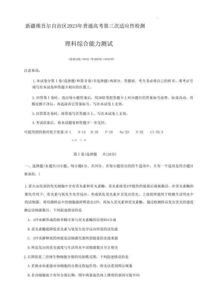 高三理综--新疆维吾尔自治区2023届普通高考第三次适应性检测