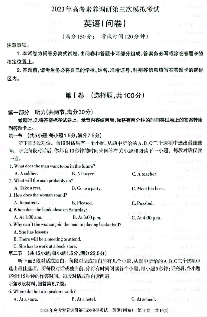 高三英语--新疆维吾尔自治区阿勒泰地区高三下学期高考素养调研第三次模考