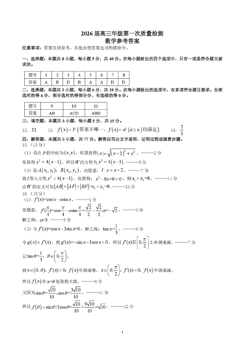 高三数学答案--河南省开封市2026届高三上学期第一次质量检测(开封一模)