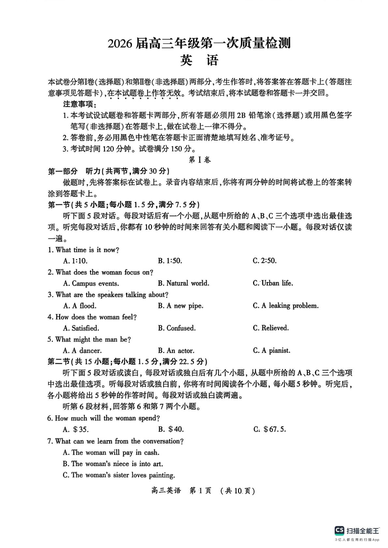 高三英语--河南省开封市2026届高三上学期第一次质量检测(开封一模)