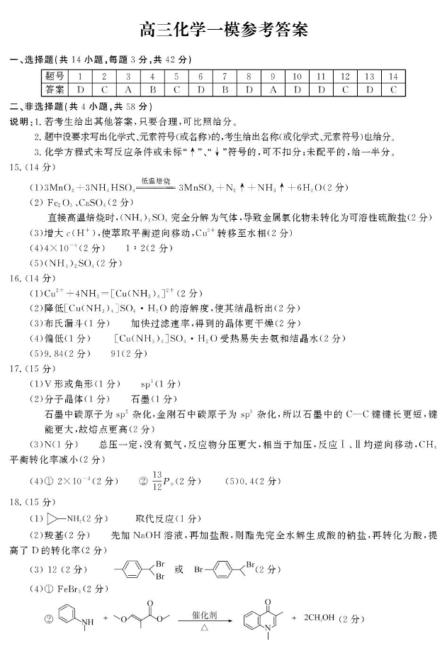 高三化学答案--河南省开封市2026届高三上学期第一次质量检测(开封一模)