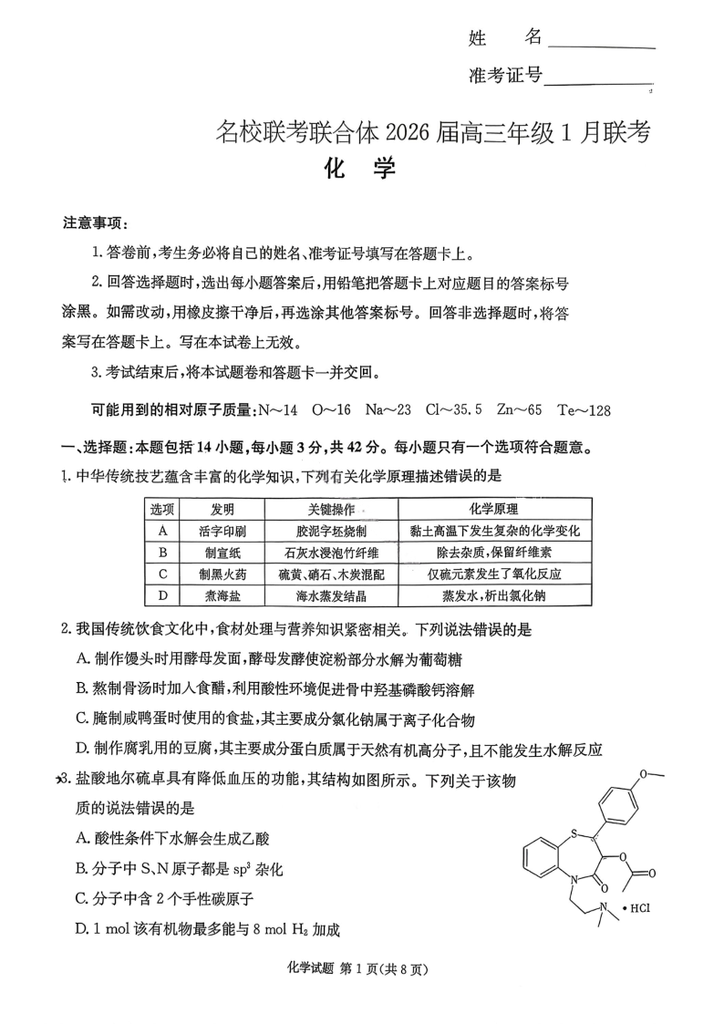 高三化学+答案--湖南省名校联考联合体2025-2026学年高三上学期1月联考