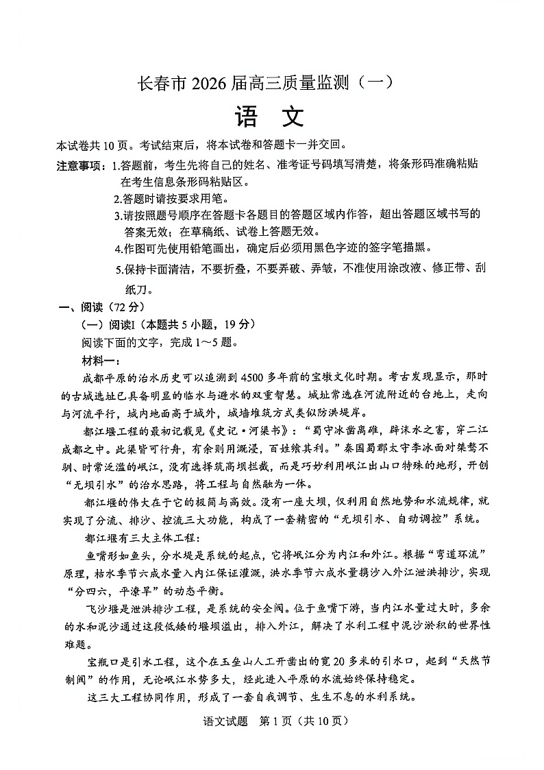 高三语文--吉林省长春市2026届高三年级质量检测(一)(长春一模)