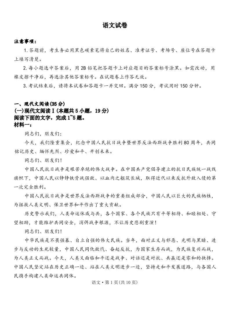 高三语文--云南师范大学附属中学2026届高三月考试卷(六)