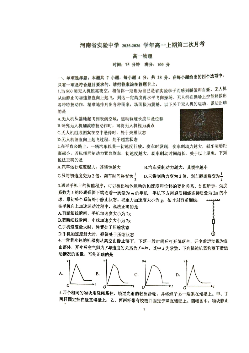 高一物理--河南省实验中学2025-2026学年高一上学期第二次月考