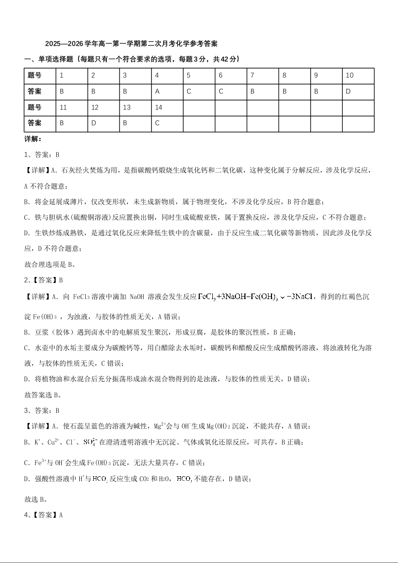 高一化学答案--河南省实验中学2025-2026学年高一上学期第二次月考