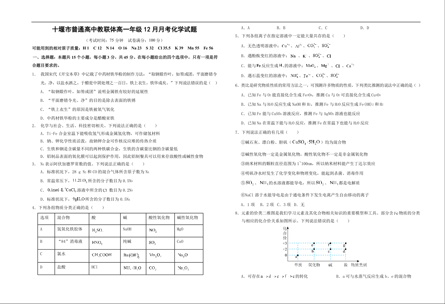 高一化学--湖北省十堰市普通高中教联体2025-2026学年高一上学期12月月考