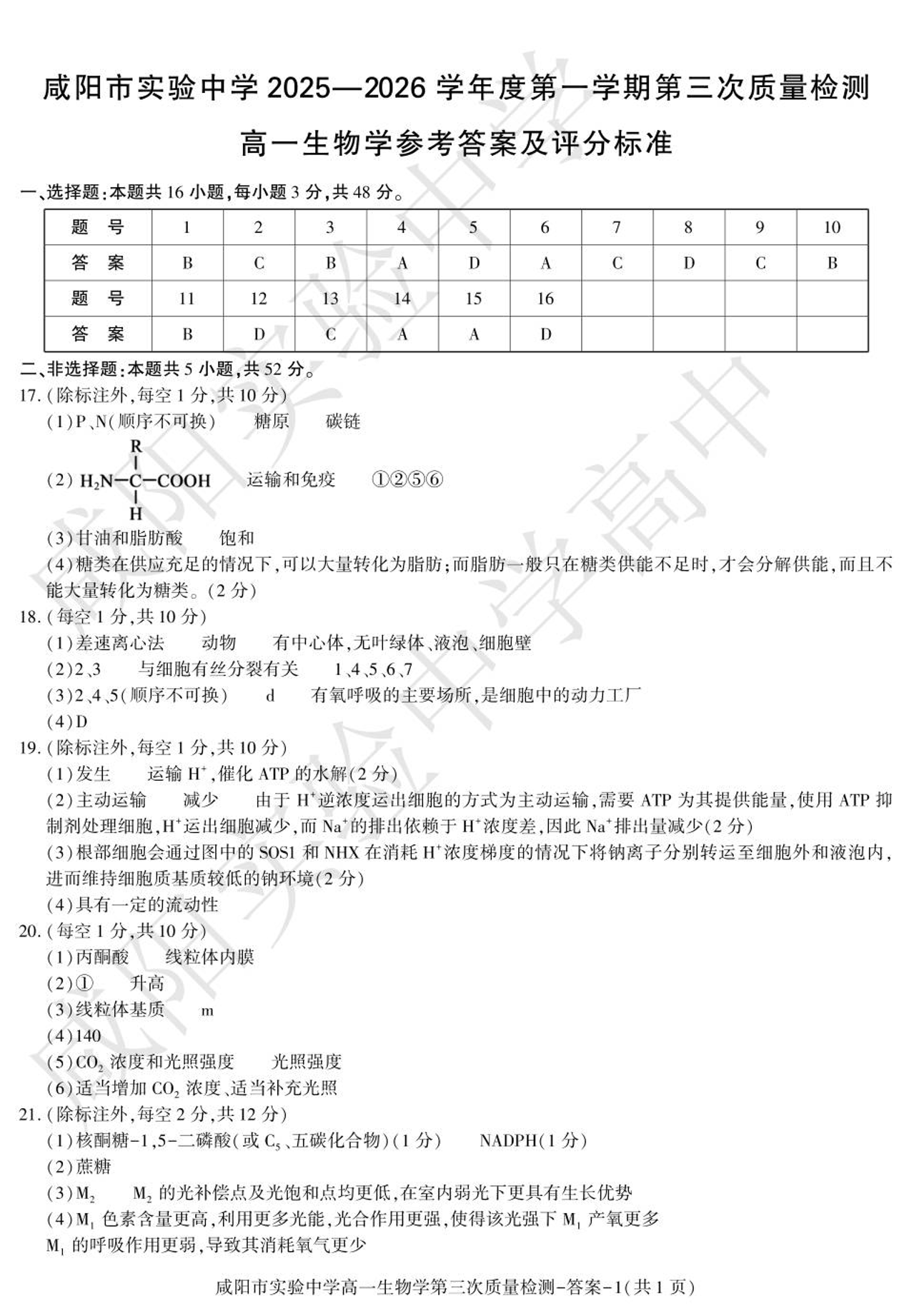 高一生物答案--陕西省咸阳市实验中学2025-2026学年高一上学期第三次质量检测