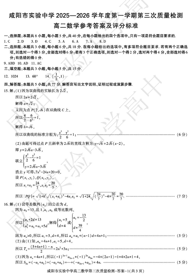 高二数学答案--陕西省咸阳市实验中学2025-2026学年高二上学期第三次质量检测