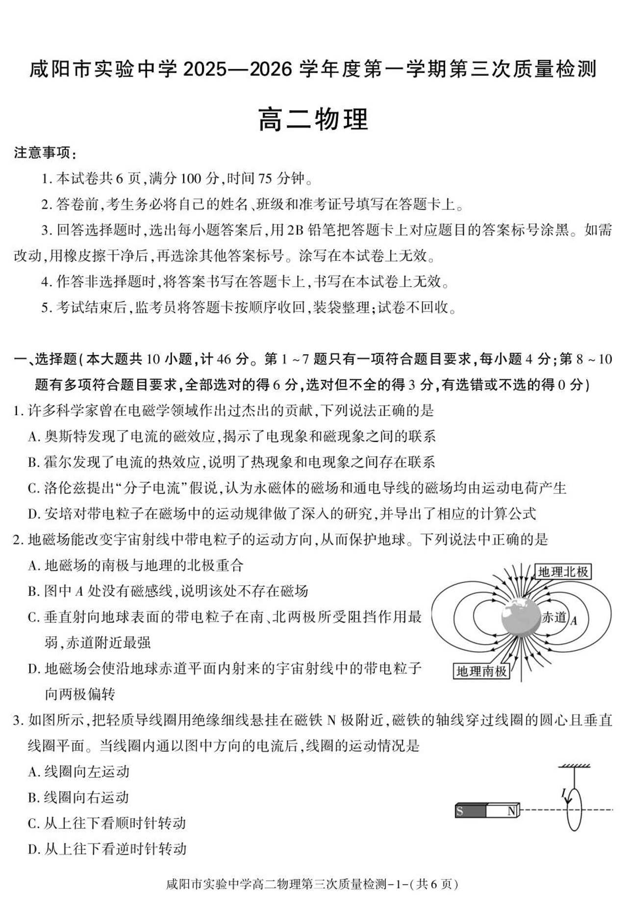 高二物理--陕西省咸阳市实验中学2025-2026学年高二上学期第三次质量检测