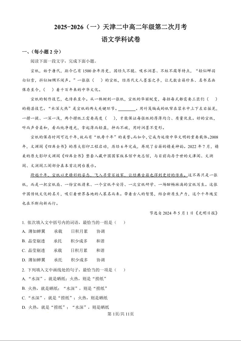 高二语文(原卷版)--天津市第二中学2025-2026学年高二上学期12月月考