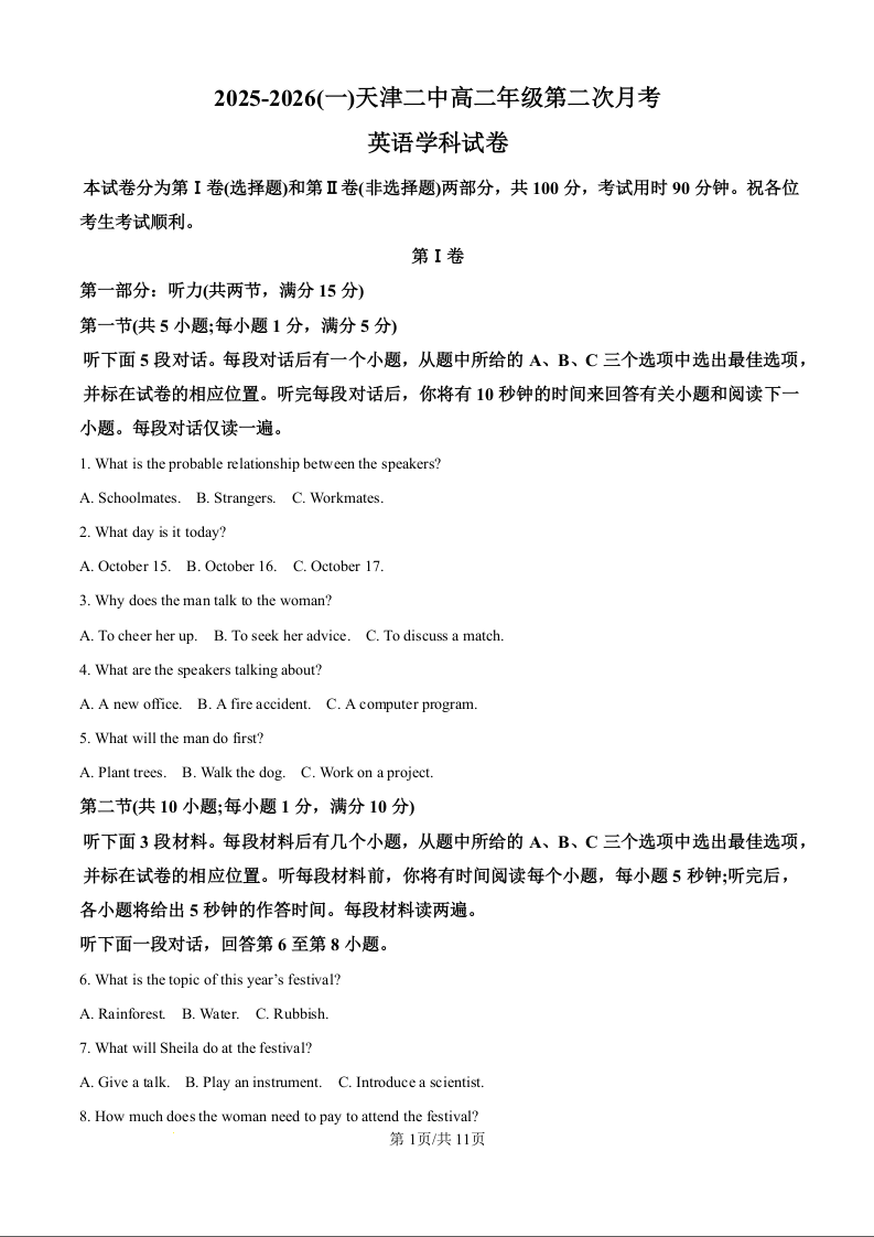 高二英语(原卷版)--天津市第二中学2025-2026学年高二上学期12月月考