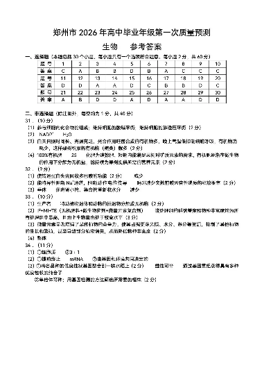 高三生物答案--河南省郑州市2026届高三第一次质量预测(郑州一模)