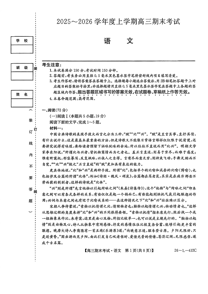 高三语文--黑龙江省齐齐哈尔市2026届高三上学期1月期末考试