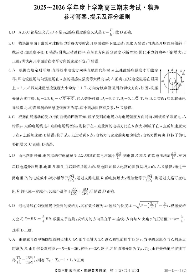 高三物理答案--黑龙江省齐齐哈尔市2026届高三上学期1月期末考试