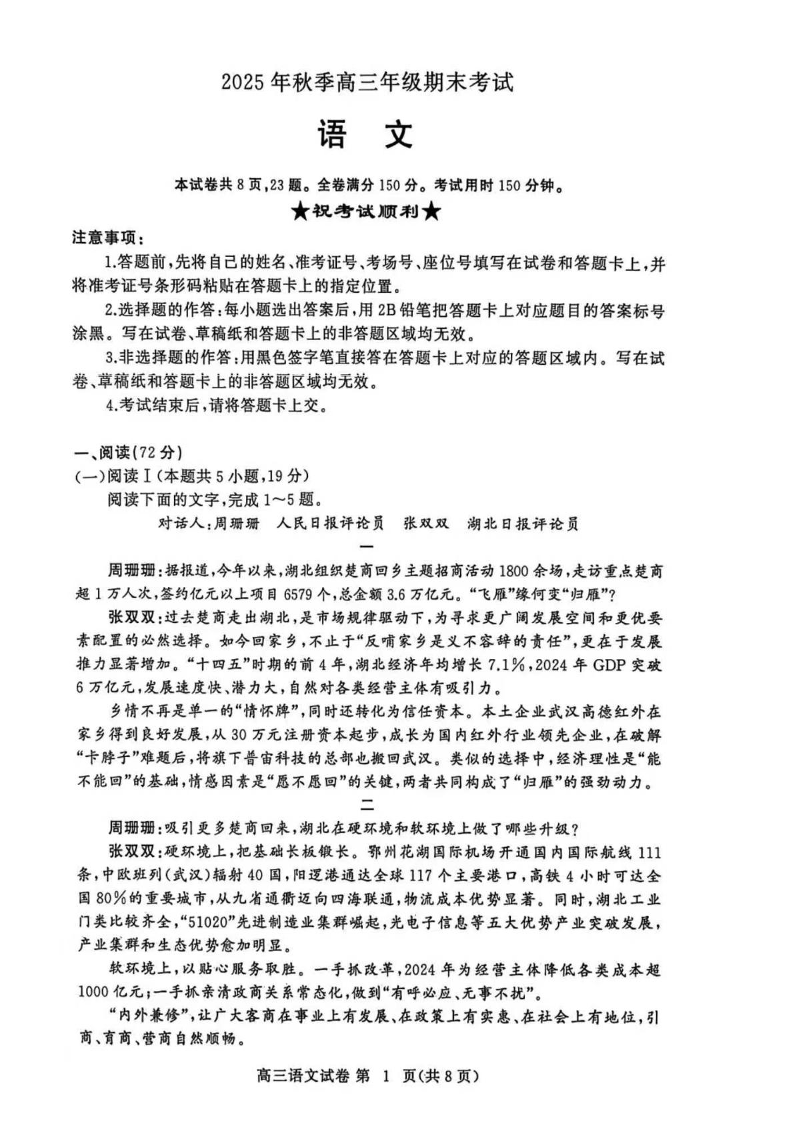 高三语文--湖北省黄冈市2026届高三上学期1月期末考试